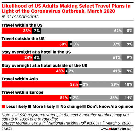 When people start making travel plans again, they are more likely to stay close to home and are showing more hesitation about traveling outside of the United States, according to eMarketer. Looking at specific areas of international travel, US adults say they will be less likely to travel to Asia (58%) and Europe (51%).