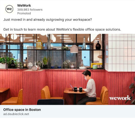 Instead of using aggressive tactics to get in users’ eye line, WeWork chose an Instagram-worthy photo of someone sitting in one of their spaces. Combined with the text “Just moved in and already outgrowing your workspace?” WeWork speaks to digital nomads who tend to sample different offices before settling on a membership. This deep insight into their audience enables the company to quickly make a good impression.