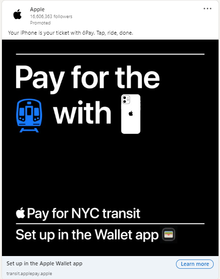 The sharp contrast of the black background with white text, and the format that mirrors a subway sign, is a nod to Apple’s ability to make advertising feel like familiar objects from users’ daily lives. The mixture of copy and symbols reinforces Apple’s “do more with less” mentality. The “tap, ride, done” copy stresses the ease of the process—Apple essentially creates a completely frictionless journey, from LinkedIn to the subway users’ doorstep.