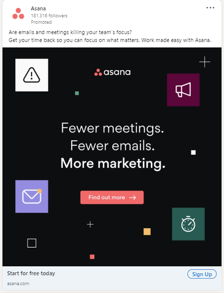 As with any kind of advertising, it can be tempting to fall into the trap of using too much copy, thus cluttering the space with design elements. Luckily, Asana does nothing of the sort, opting for a sleek, minimal aesthetic with only four widgets and three simple statements. The messaging clearly hones in on Asana’s value: time-saving and convenience. The neutral colors make everything easy to digest, and the simplicity of the ad is great for brand awareness.