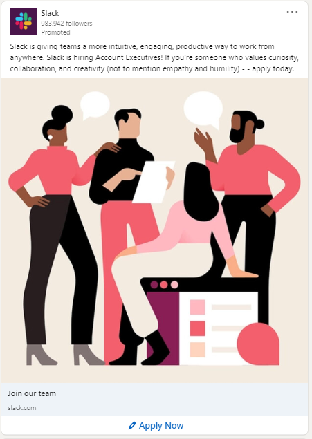 The messaging giant Slack is no stranger to effective design and communication, so it’s no surprise that its LinkedIn ad appears on our list. Slack’s classic illustration style is featured in its ad, using brand colors to subtly remind users of its recognizability in the tech space. Slack is hoping to attract new employees with this ad and is using the “job applicant LinkedIn objective” which auto-fills users’ information, enabling them to easily apply in just a few clicks.