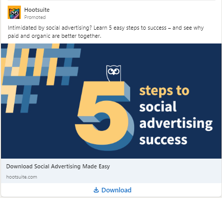As a social media management resource, Hootsuite doesn’t let us down when it comes to LinkedIn ads. Its content includes the iconic owl, and takes a “does what it says on the tin” approach, offering five steps to social advertising success. The lead-gen ad has a clear call-to-action (CTA) to download its document—a savvy step that requires users to provide their information in exchange for gated content.