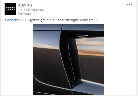 Audi takes somewhat of a left turn (pun intended) with its LinkedIn ad. Rather than showcase a standard photo of one of its cars, the brand zooms in on an ambiguous part of the vehicle, asking users to guess what’s being shown. The tactile nature of the photo is enough to make anyone stop scrolling, squint, and take a stab at an answer. Even though it’s a static photo, the ad is interactive because it starts conversations, and conversations increase the likelihood of trending, new remarketing audiences, and conversions.