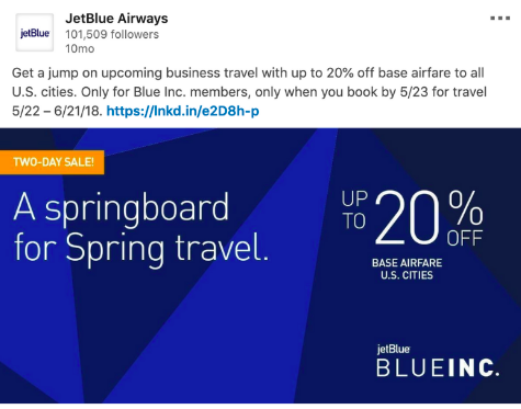 There’s nothing like a little wordplay to give your LinkedIn ad some momentum, and JetBlue did so flawlessly with their ad from earlier this year. “Springboard for spring travel” encourages people to plan their vacation ahead of time and seize the promo discount. The “20% off” is naturally the largest text on the ad, while the “two-day sale” banner contributes an extra sense of urgency. Interestingly, most of JetBlue’s LinkedIn content isn’t overly salesy, it instead has an informative feel that compels people to take action of their own accord.