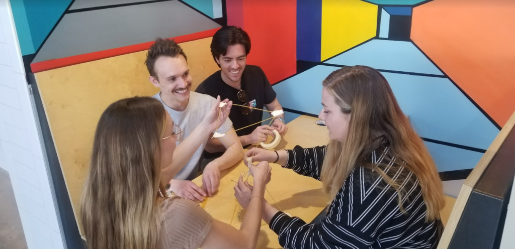 Team members work together to create a tall structure only using pasta noodles, tape, and a marshmallow.